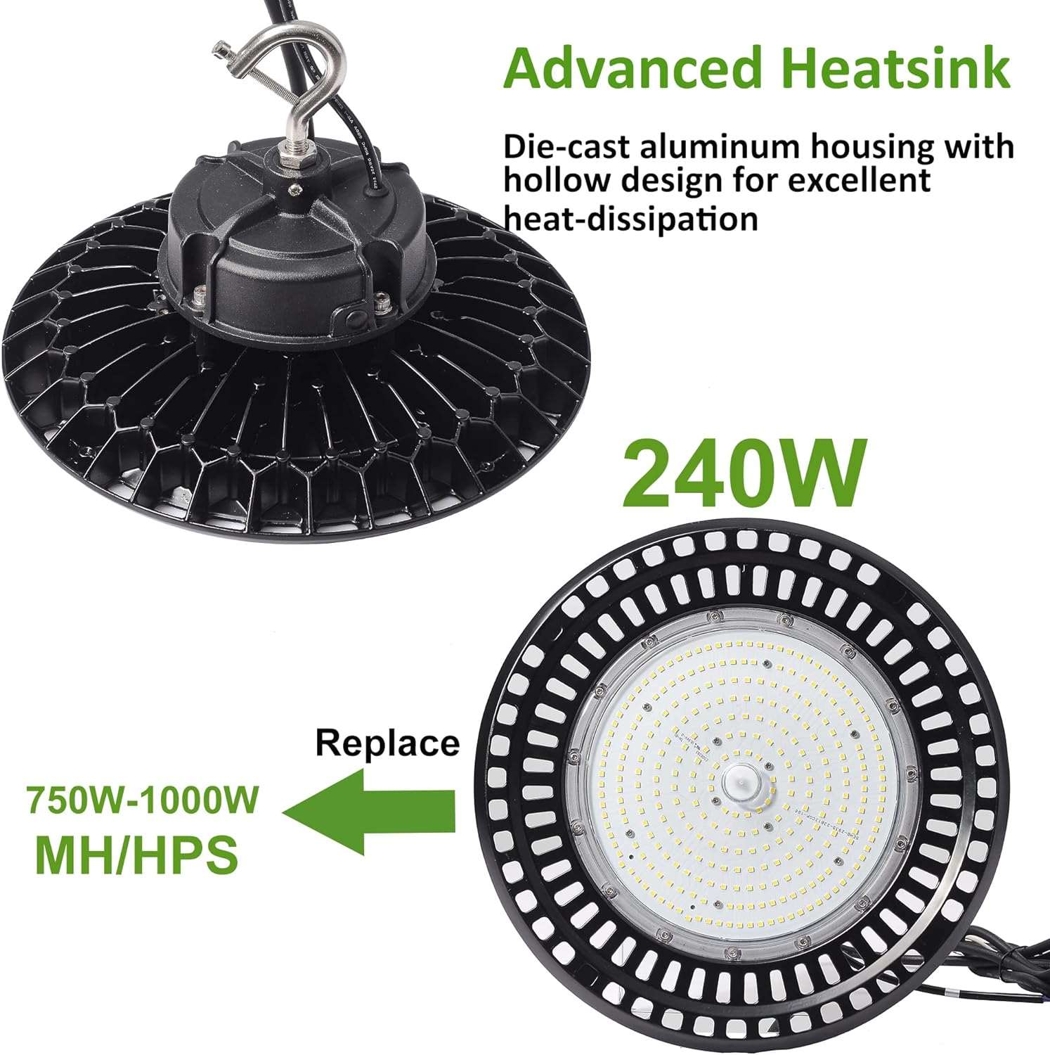 【Easy Installation】- This high bay comes with US rugged mounting hook, 5ft power cord, safe rope and installation manual included. Hook mount makes the UFO high bay lights easier to hang. Simple to replace existing lights or make a new installation.