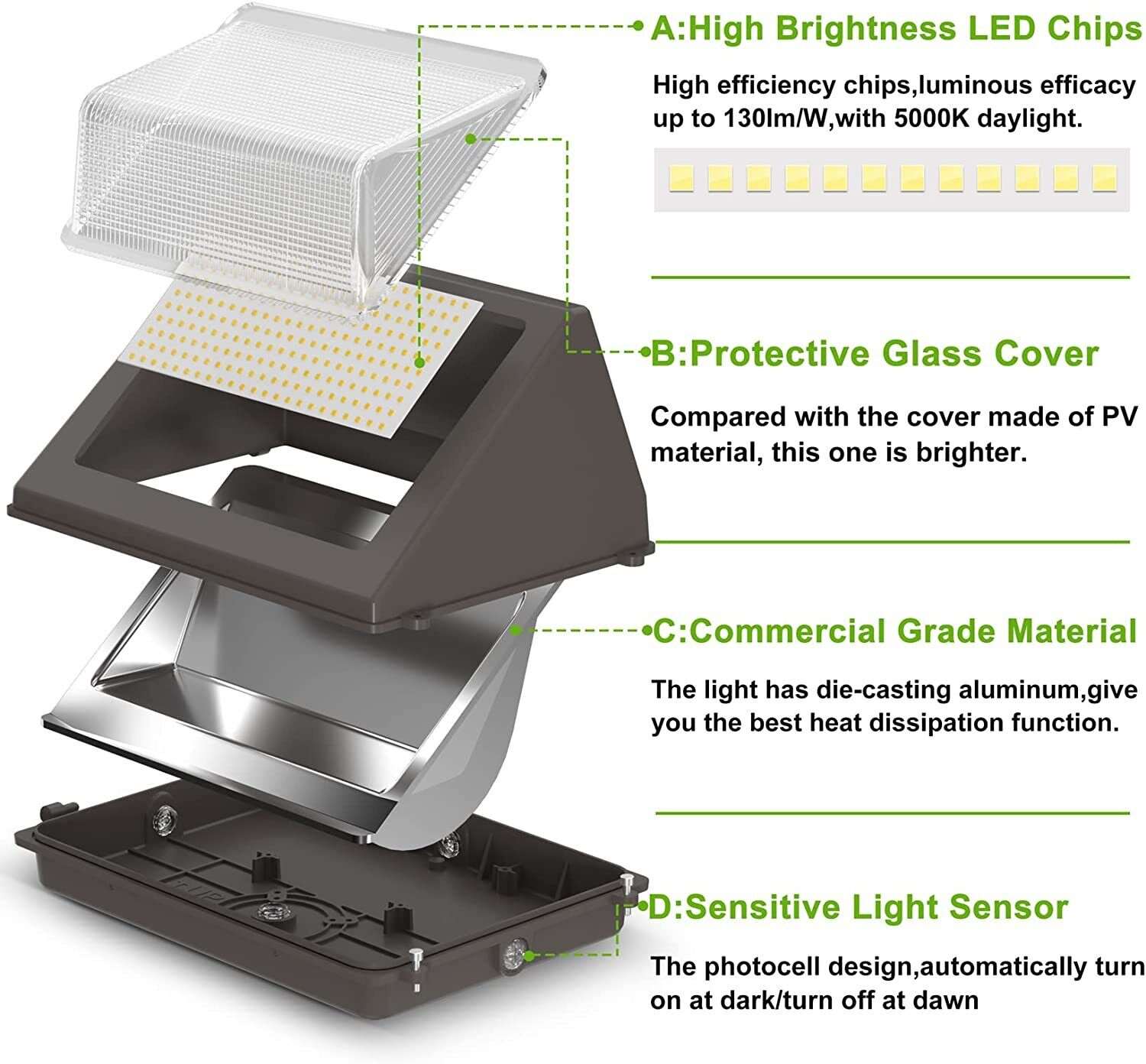 100W Glass Cover Outdoor Security Lights 13,000LM for House Dusk to Dawn Wall Pack 5000K Daylight Photocell Sensor ETL 120-277V